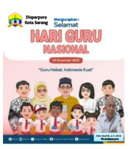 DINAS PARIWISATA,PEMUDA DAN OLAHRAGA KOTA SERANG detikind | 25 November 2025, 05:25 am | 0 comments | 4 views Mengucapkan: “SELAMAT HARI GURU NASIONAL ” 25 – November – 2025 “GURU HEBAT,INDONESIA KUAT”